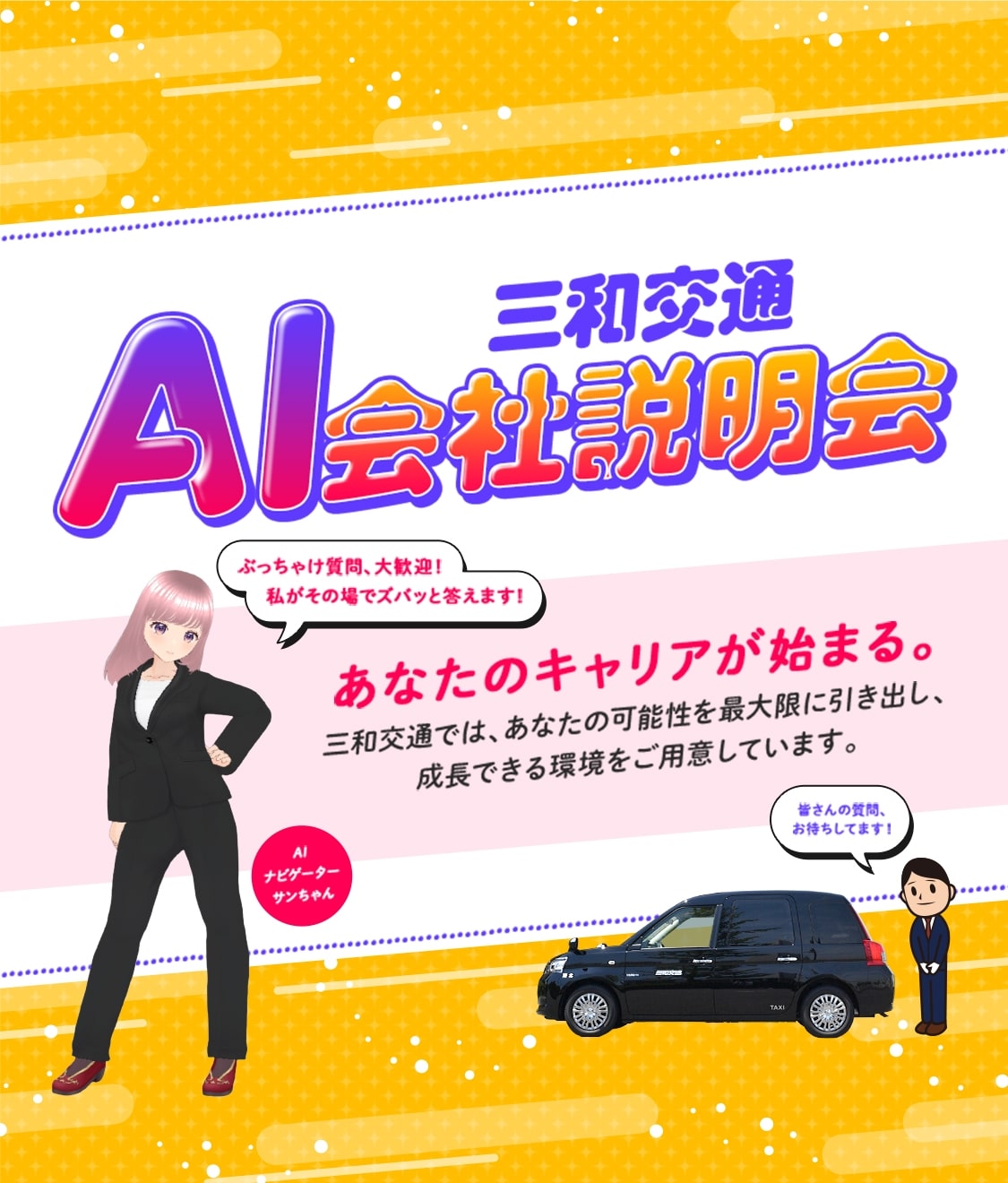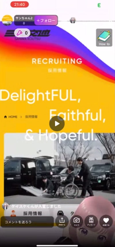 日本初!?AIに“ぶっちゃけ質問”できる会社説明会を開催中!毎日0時から2時間ごとに、ライブ配信で実施しています。案内役は、当社オリジナルAIキャラクター「サンちゃん」。会社のこと、働き方のこと、ちょっと聞きづらい質問までOK!コメントを送ると、その場でサンちゃんがリアルタイムにお答えします。「気軽に話を聞いてみたい」「まずは雰囲気を知りたい」そんな方にもおすすめの新しいカタチの会社説明会です。